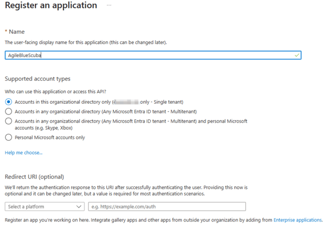 - Provide a name for the application (use any name that can be easily referenced, ex. AgileBlueScuba)