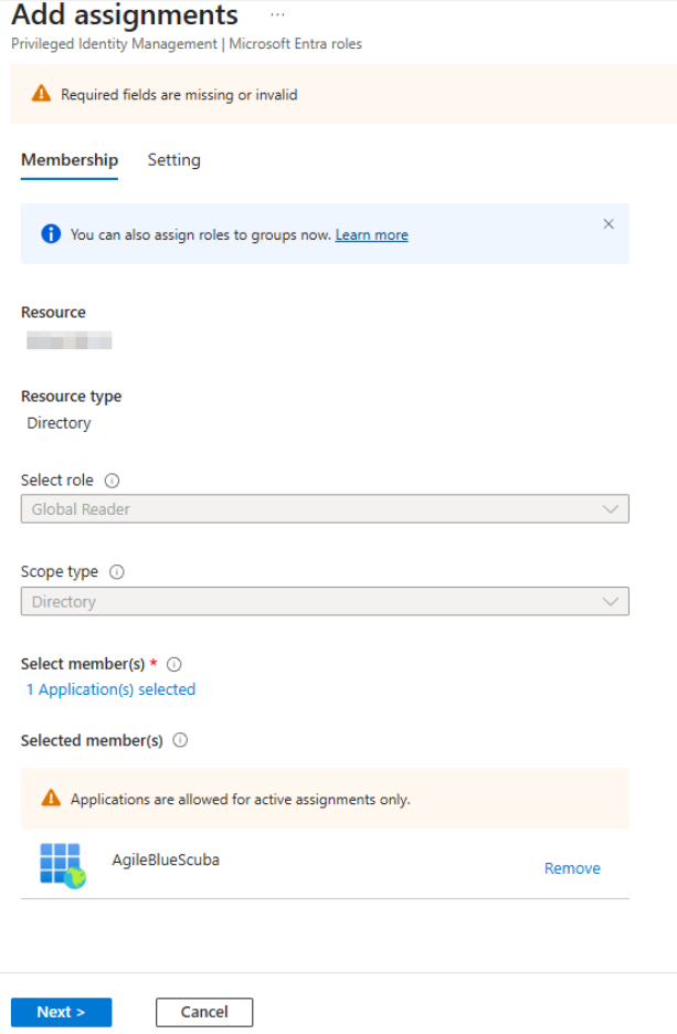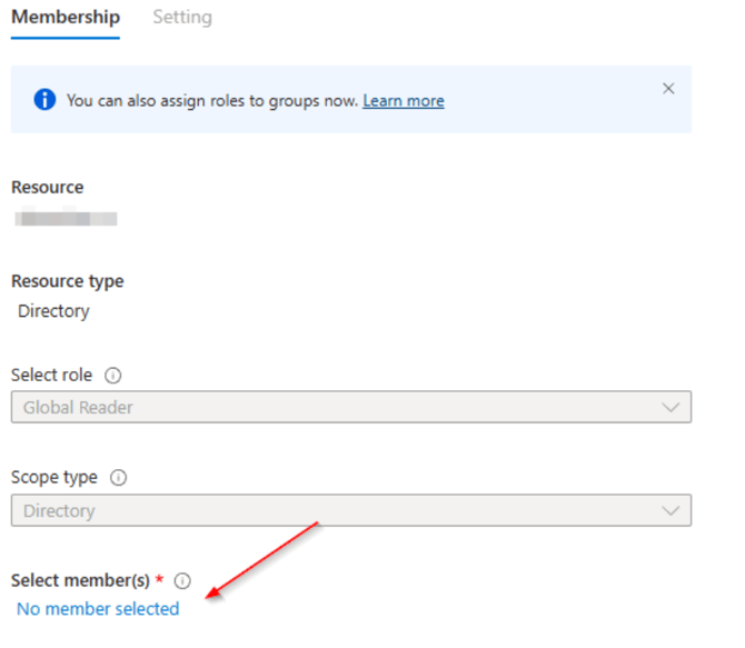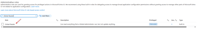 - Click the Global Reader role text; DO NOT click on the checkbox